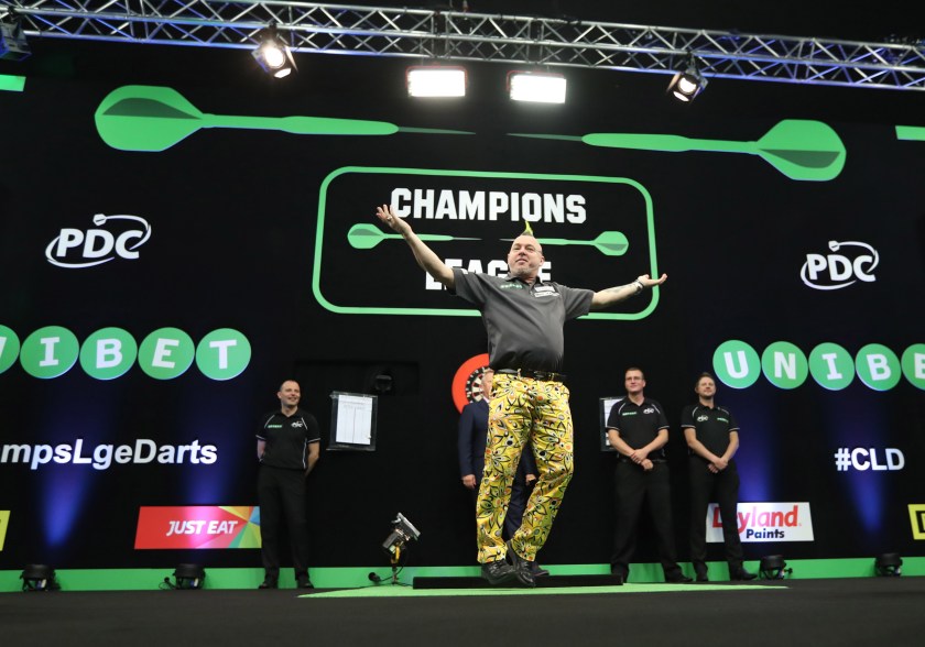 Previous Image Next Image CHAMPSLGE-GP1-WRIGHT1 Peter Wright delights the Cardiff crowd during his walk on
