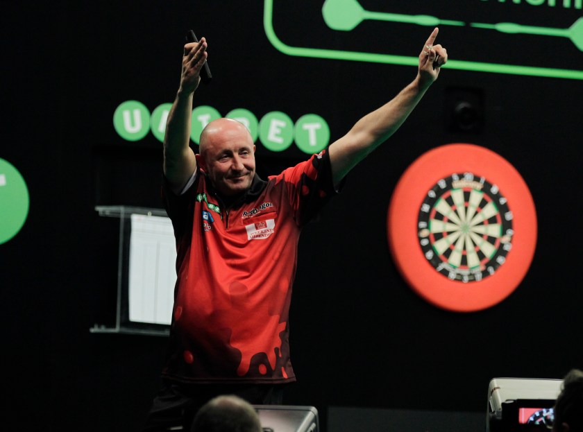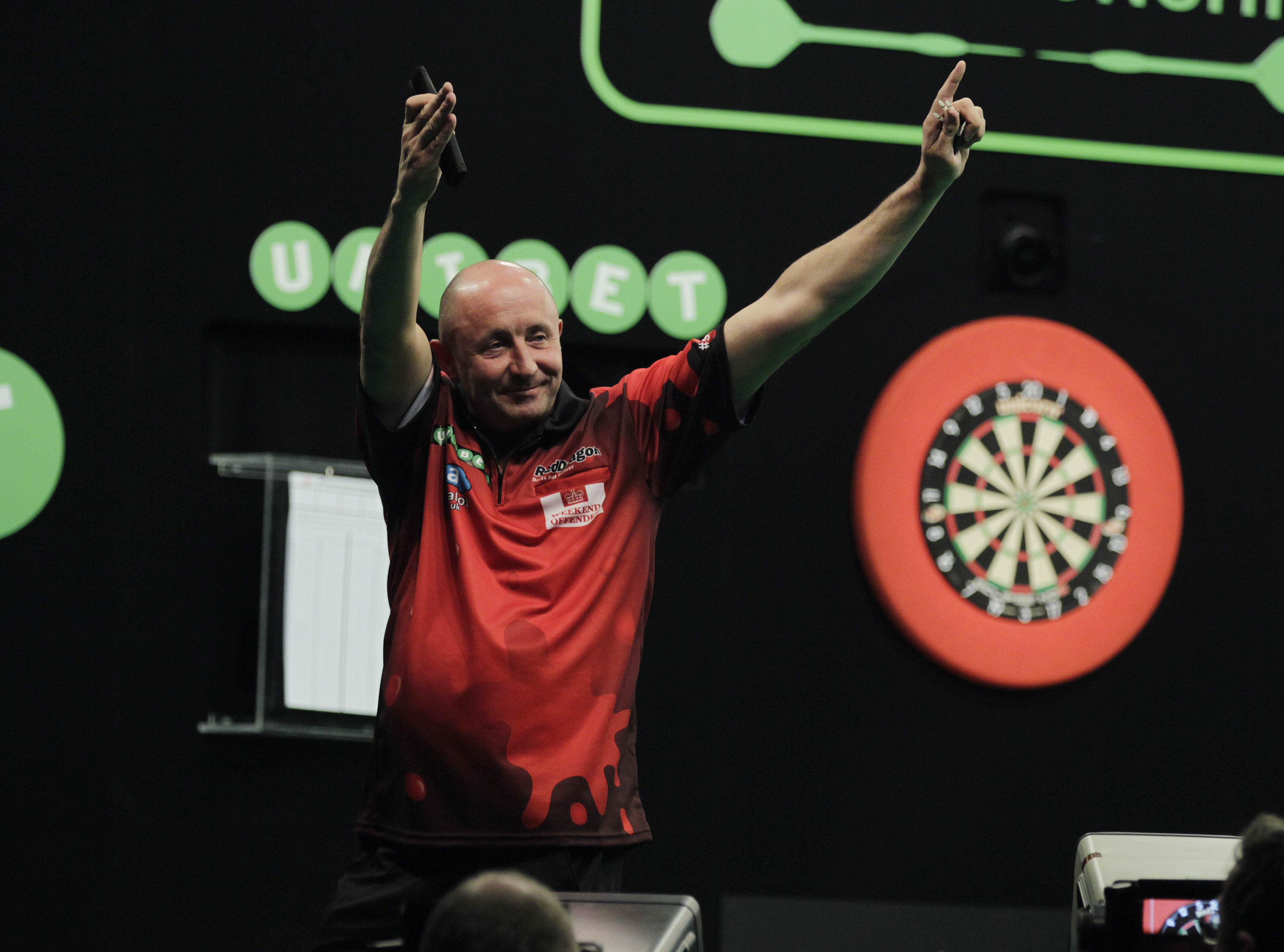 Previous Image Next Image DARTS UNIBET EUROPEAN CHAMPIONSHIP 2016 ETHIAS ARENA,HASSELT,BELGIUM PIC;LAWRENCE LUSTIG ROUND 2 JAMES WILSON V MERVYN KING JAMES WILSON IN ACTION
