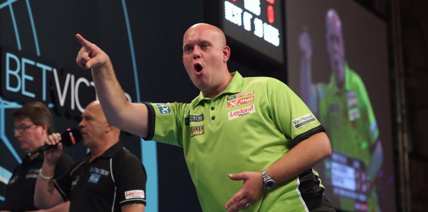 Previous Image Next Image DARTS BET VICTOR WORLD MATCHPLAY 2017, WINTER GARDENS, BLACKPOOL, PIC;LAWRENCE LUSTIG ROUND 1 MICHAEL VAN GERWEN V STEPHEN BUNTING MICHAEL VAN GERWEN IN ACTION