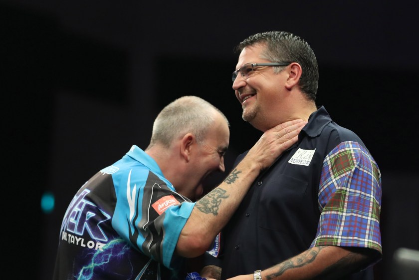 Phil Taylor and Gary Anderson having fun on stage
